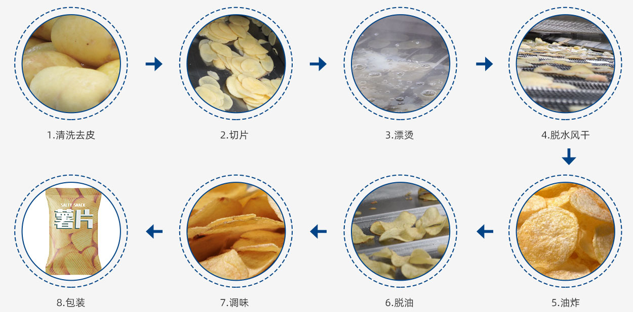 油炸薯片生產線,包括馬鈴薯去皮清洗、切片、除雜、漂洗、漂燙、冷卻、風干、油炸、脫油、調味、包裝等全制程自動化過程,完成從馬鈴薯到油炸薯片成品的整個生產過程。