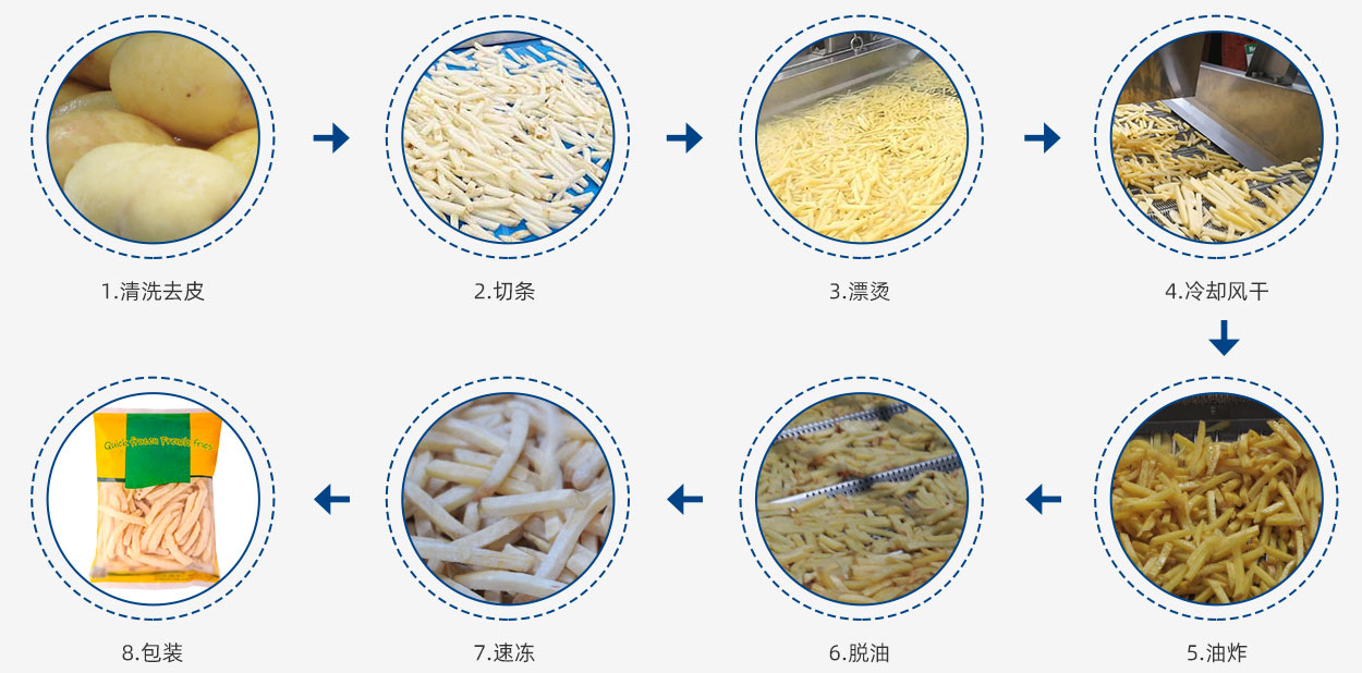 該生產(chǎn)工藝解決方案包括馬鈴薯去皮清洗、切條、除雜、漂洗、漂燙、冷卻、風(fēng)干、油炸、脫油、速凍、包裝等全制程自動(dòng)化過(guò)程。
