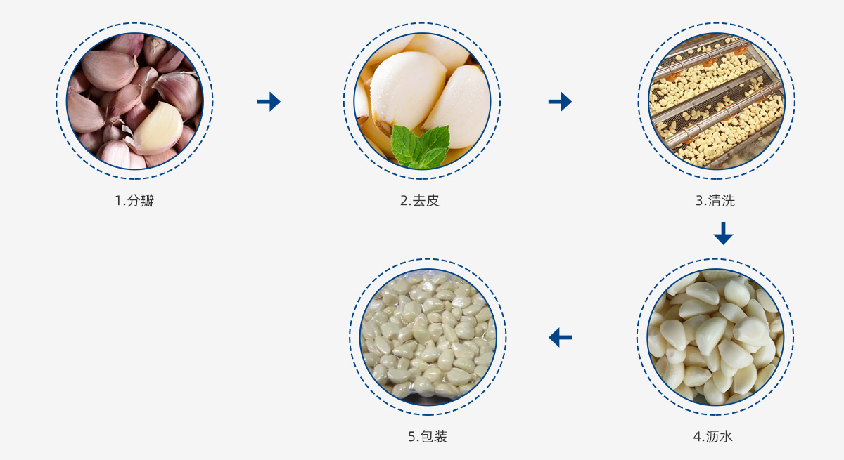 保鮮大蒜加工解決方案是專為加工大蒜而研發(fā)的,大蒜經(jīng)分瓣、去皮、清洗、瀝水、包裝等工藝,能夠保持新鮮。整個(gè)過程大蒜都在密閉的環(huán)境下處理